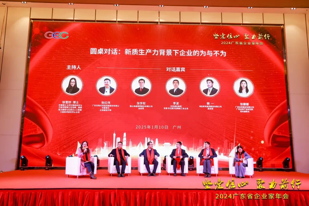 唐军在致辞中强调,2025年,是“十四五”规划收官之年,也是省企联改革发展的关键之年。省企联将深入贯彻落实习近平总书记对广东系列重要讲话和重要指示精神,充分利用粤港澳大湾区和广东的区位优势和发展潜力,完整、准确、全面贯彻新发展理念,服务和融入新发展格局,坚持干字当头,增强信心、迎难而上、奋发有为,致力把协会锻造成广大会员企业真正可信赖的“家园、桥梁、平台”。要把准会员企业的脉搏,紧紧抓住为会员企业服务、为会员创造价值的核心使命,围绕会员企业的所思、所想、所求,不断优化会员服务内容,创新服务项目,提升服务能力,提高服务水平,进一步增强会员的向心力和凝聚力;要围绕制造业当家和百千万工程等重点工作,整合省级层面政策资源,地市政府产业资源,金融机构项目渠道资源,龙头企业产业赋能资源,帮助企业因地制宜发展新质生产力,助推企业做强做优做大;要更扎实搭建政企沟通服务平台,总结推广企业先进经验,倾听企业和企业家心声,了解企业改革发展的难点堵点,准确及时反映企业的真实情况和诉求,发挥政府的助手作用、协调企业解决问题的帮手作用、助力企业经济高质量发展的推手作用;要围绕省委省政府的工作部署,不断提高政治站位、强化政治担当,进一步加强自身建设,深入推进党建与协会工作互促互进,强化协会工作的创新改革,做深做透服务项目,高质量办好各项活动,与广大会员企业一起踔厉奋发、砥砺前行。 年会邀请了金融界、企业界、科技界的领导、专家等,围绕会员企业当前最关心的话题开展圆桌对话。来自广东恒健资产管理有限公司、广州工控资本管理有限公司、深圳市松禾资本管理有限公司、兴业银行广州分行、佛山标美服饰有限公司、广东梁氏水产种业有限公司、广州中科宇航探索科技有限公司的嘉宾,围绕“企业投融资合作的开局之道”主题,结合自身经验,从不同角度出发,对企业投融资中存在的问题及难题进行全面探讨和分析,并给出了推进企业投融资合作的建议。 华南理工大学计算机科学与工程学院博士生导师、教授、副院长,华南理工大学广州国际校区峻德书院副院长,广东省大模型与生成式人工智能工程技术研究中心主任徐雪妙受邀主持了主题为“新质生产力背景下企业的为与不为”的圆桌对话,与来自广东东阳光科技控股股份有限公司、佛山电器照明股份有限公司、京信通信系统控股有限公司、海信家电集团股份有限公司、广州视源电子科技股份有限公司、广发证券股份有限公司的嘉宾,共同分析了企业在发展新质生产力中面临的机遇和挑战,探讨企业借助新质生产力保持竞争优势的有效对策。